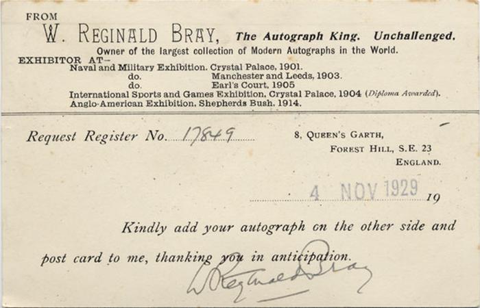 Postcard sent by Bray to Edward James Gibson Holland on 4th November 1929 asking for his autograph.