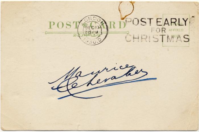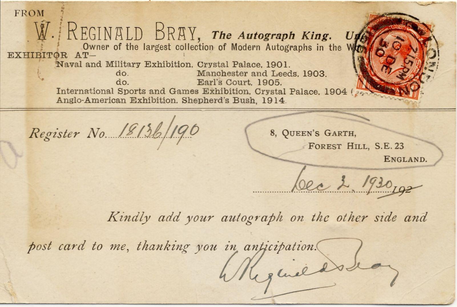 Postcard sent by Bray to Maurice Chevalier on 2nd December 1930 asking for his autograph.