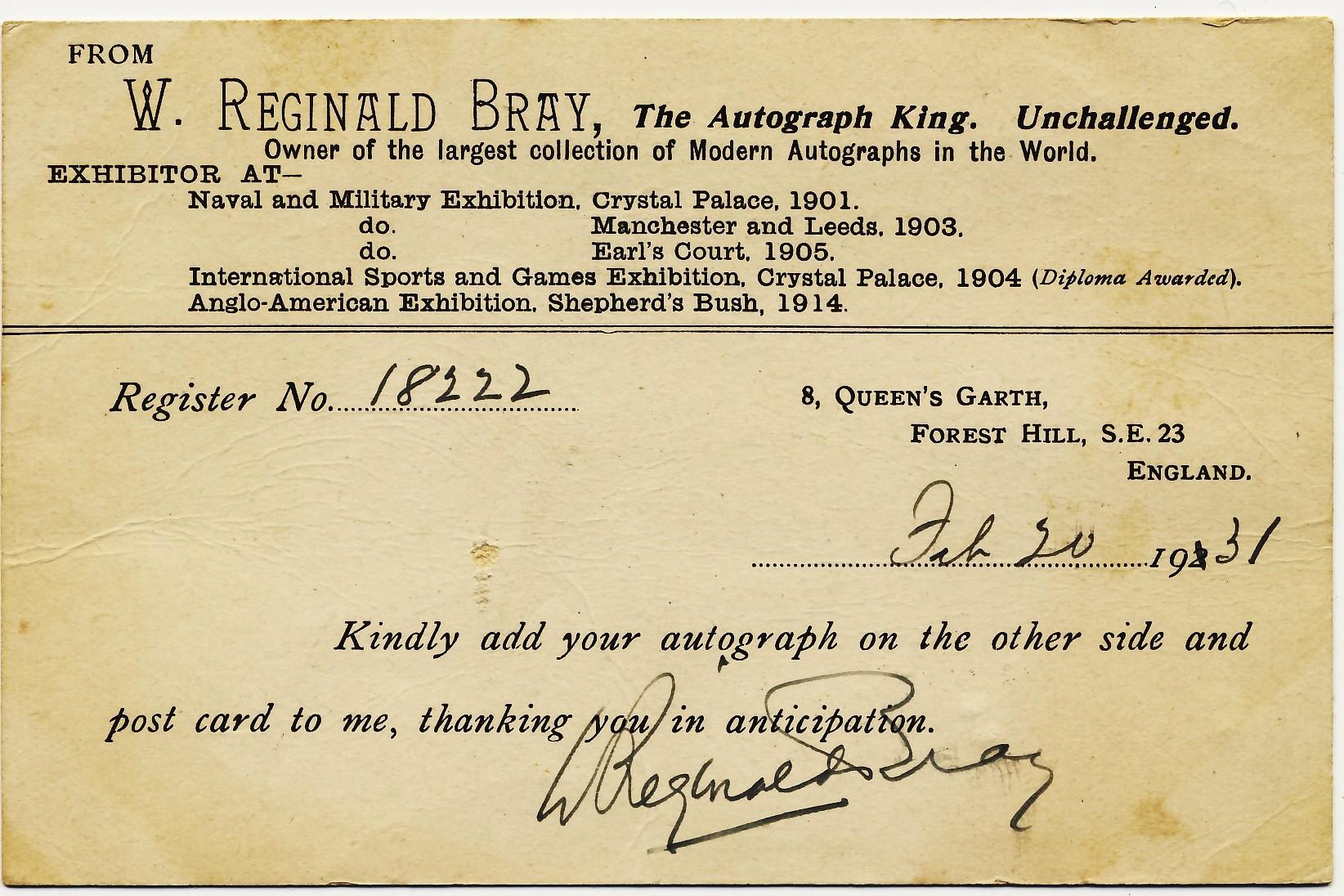 Postcard sent by Bray to Charlie Chaplin on 20th February 1931 asking for his autograph.