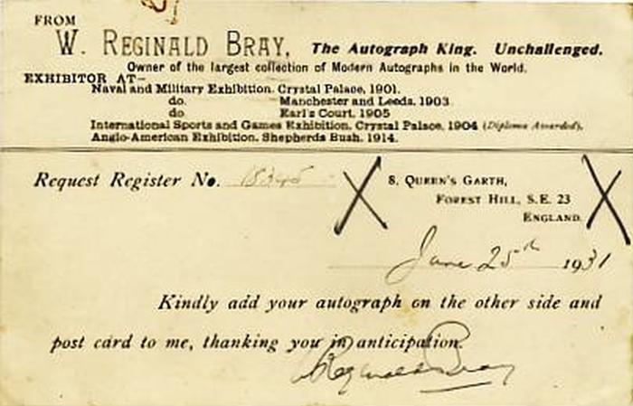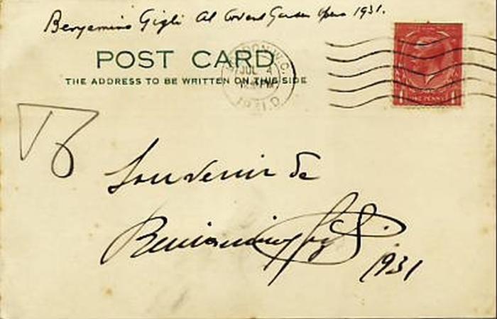 Postcard sent by Bray to Beniamino Gigli on 25th June 1931 asking for his autograph.