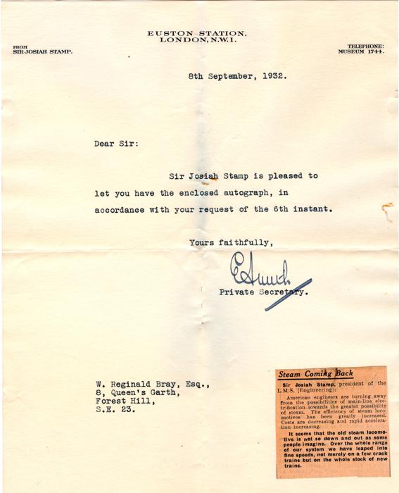 Postcard sent by Bray to Sir Josiah Stamp on 6th September 1932 asking for his autograph.