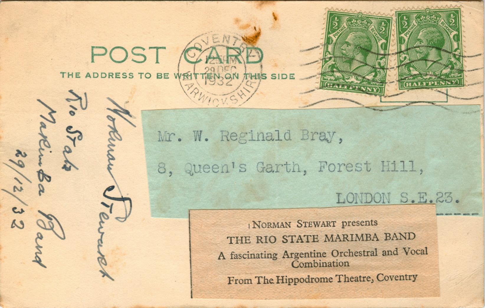 Postcard sent by Bray to Norman Stewart on 28th December 1932 asking for his autograph.