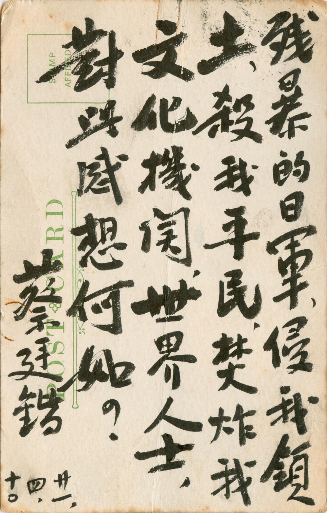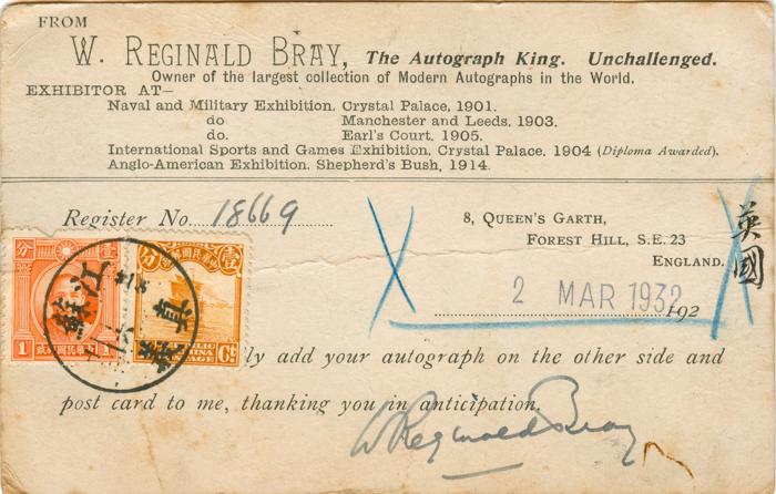 Postcard sent by Bray to General Cai Tingkai on 2nd March 1932 asking for his autograph.