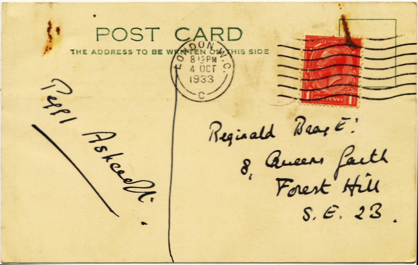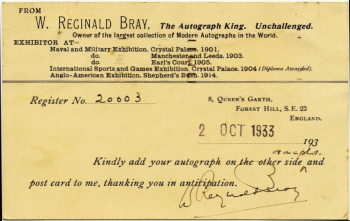 Postcard sent by Bray to Peggy Ashcroft on 2nd October 1933 asking for his autograph.