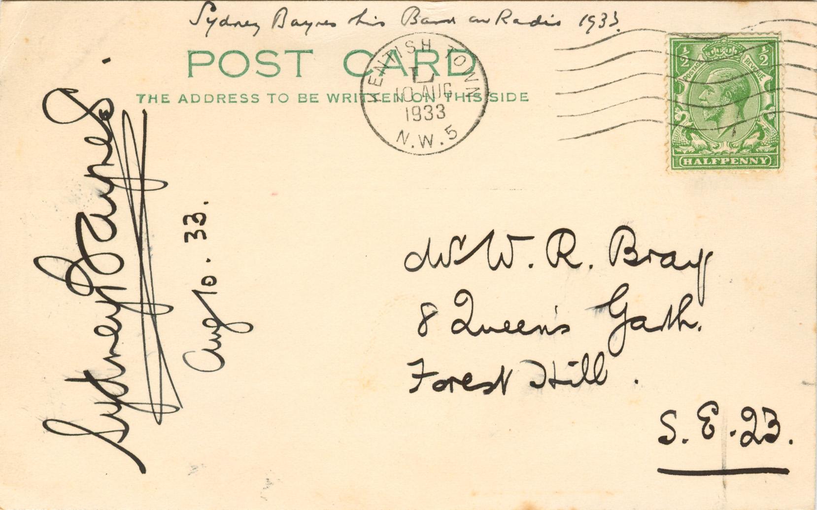 Postcard sent by Bray to Sydney Baynes on 5th August 1933 asking for his autograph.