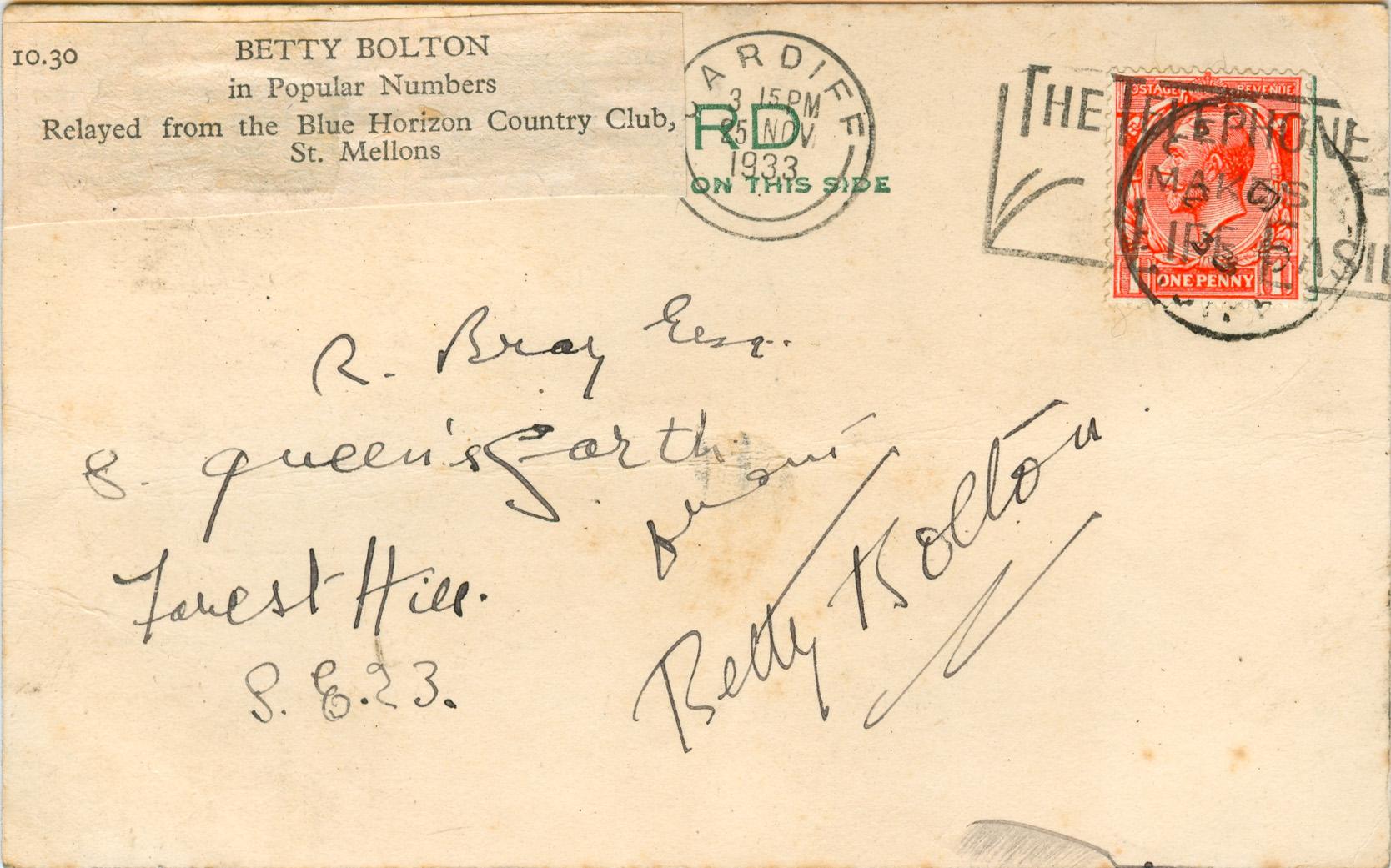 Postcard sent by Bray to Betty Bolton on 23rd November 1933 asking for her autograph.