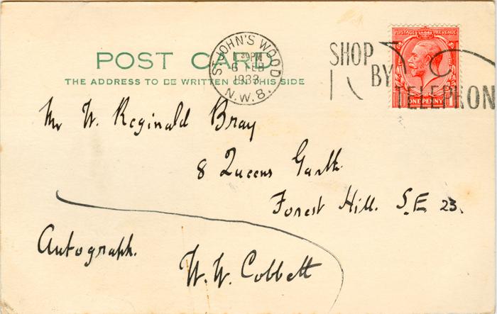 Postcard sent by Bray to Walter Wilson Cobbett on 1st February 1933 asking for his autograph.