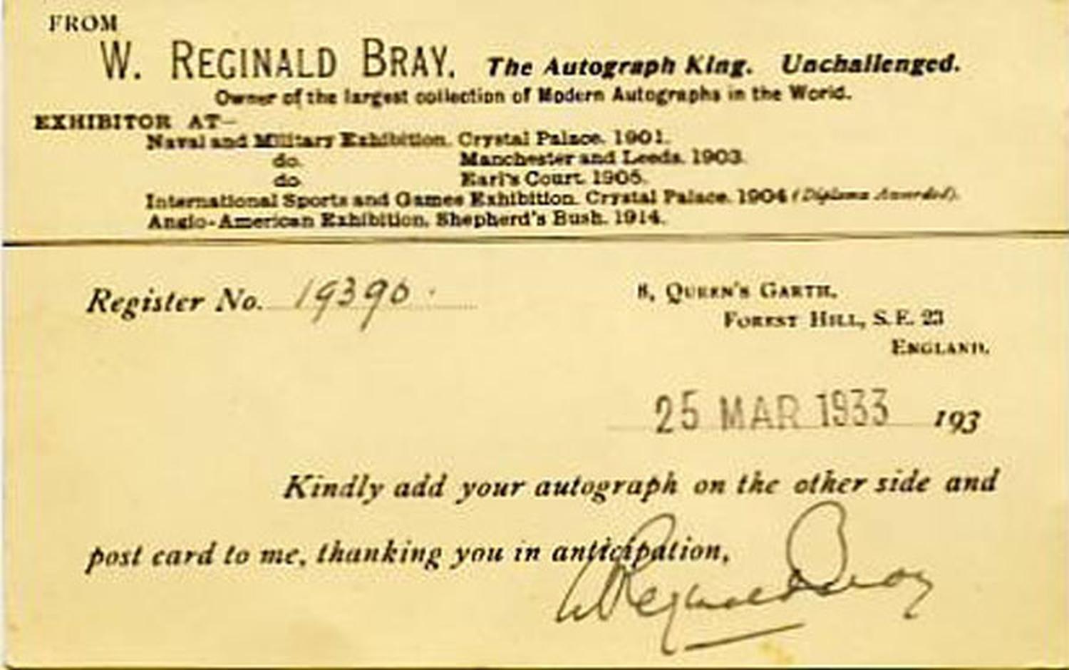 Postcard sent by Bray to Doris Waters on 25th March 1933 asking for her autograph.