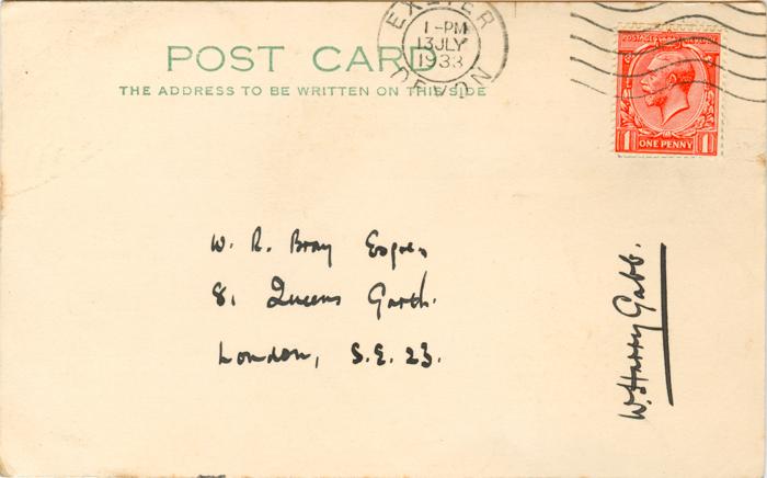 Postcard sent by Bray to W Harry Gabb on 1st July 1933 asking for his autograph.