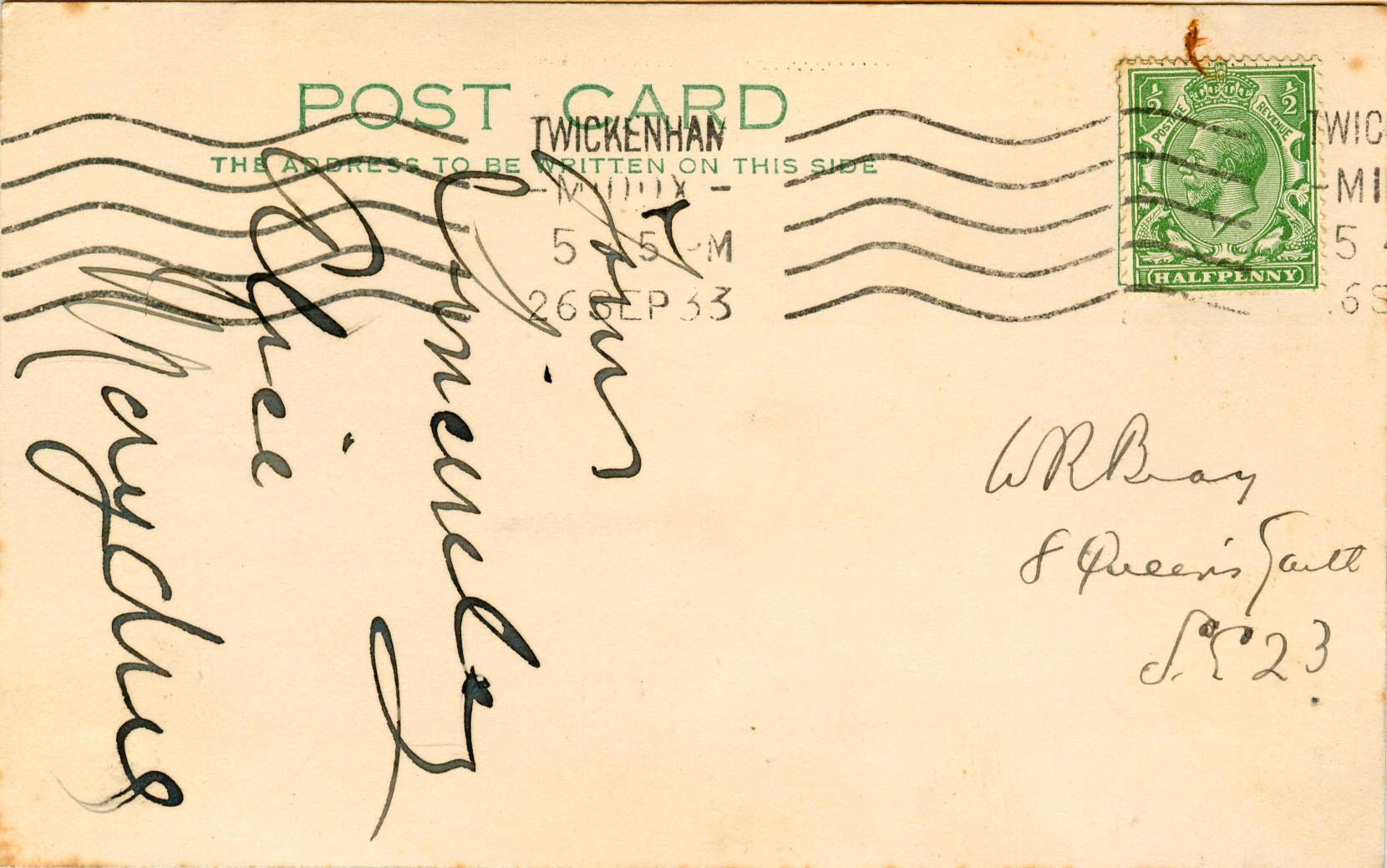 Postcard sent by Bray to Alice Maydue on 25th September 1933 asking for her autograph.