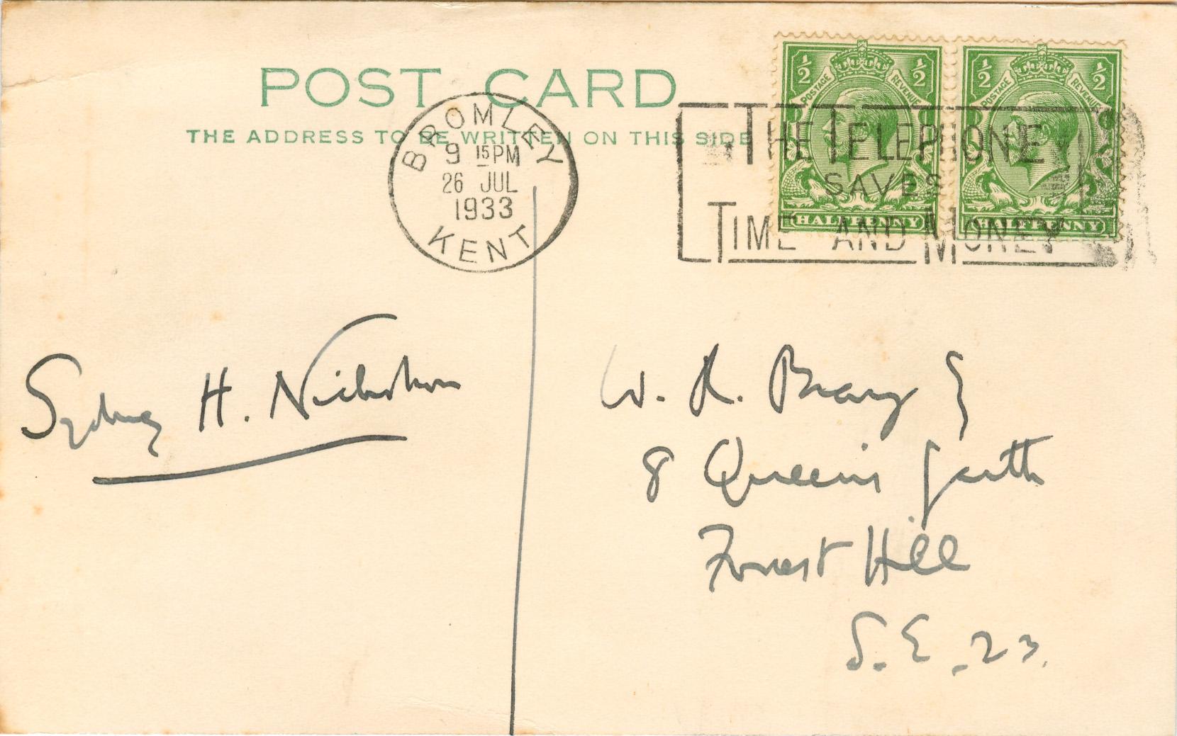 Postcard sent by Bray to Sir Sydney Hugo Nicholson on 15th July 1933 asking for his autograph.