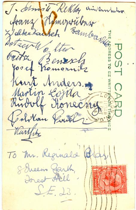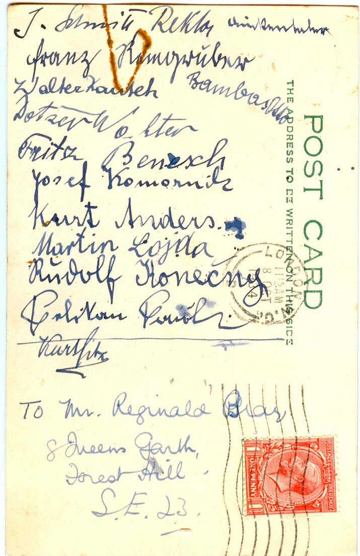 Postcard sent to Bray, bearing 13 autographs, on 5th October 1934.