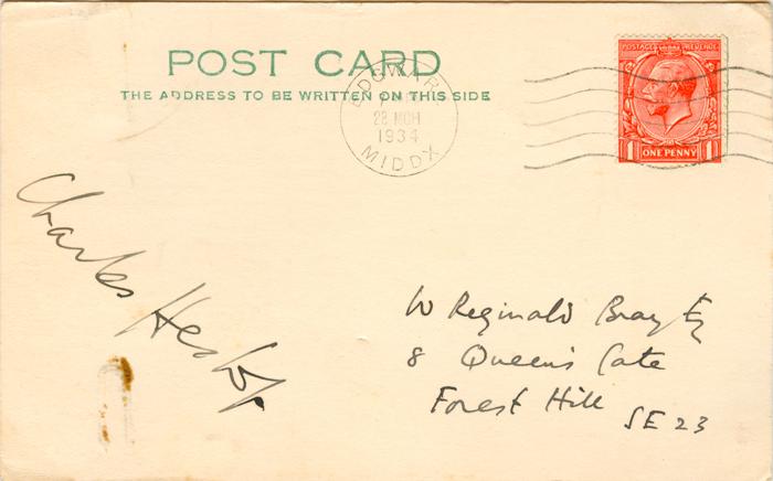 Postcard sent by Bray to Charles Heslop on 12th March 1934 asking for his autograph.