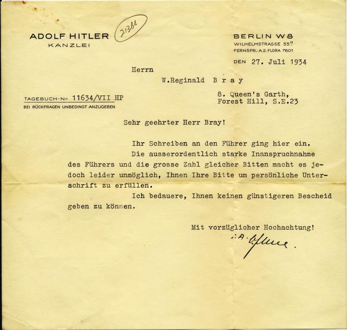 Letter sent to Bray on 27th July 1934 rejecting his request for Hitler's autograph.