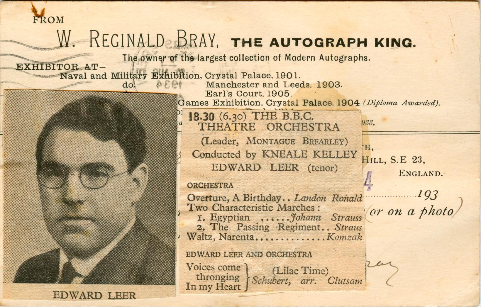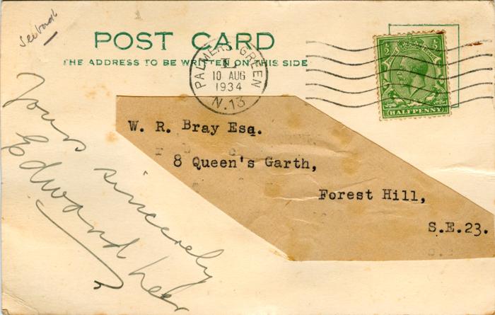 Postcard sent by Bray to Edward Leer on 1st August 1934 asking for his autograph.