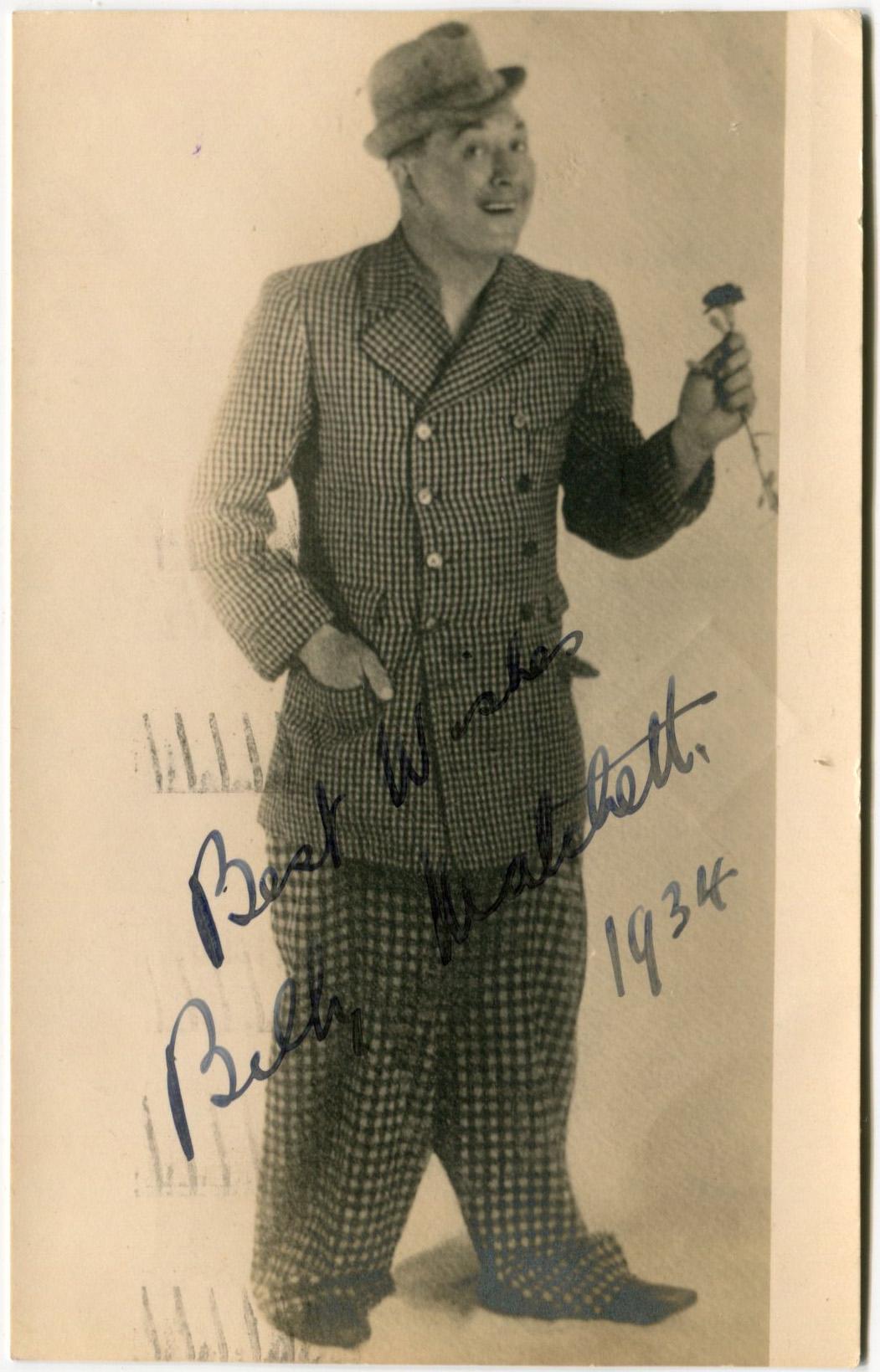 MATCHETT, William Charles 'Billy' [1889 - 1974], sometimes billed as the 'Mirthquake', was probably at the height of his fame as a comedian during the 1920s and 1930s. Throughout the 1930s he appeared in many touring shows with 'The Two Leslies' - Sarony and Holmes - and often with Sandy Powell in summer seasons. He frequently broadcast on radio, from the 1930s to the 1960s in variety programmes such Workers' Playtime. In later years he specialised in 'Old Tyme Music Hall' either with his own act or as Chairman.