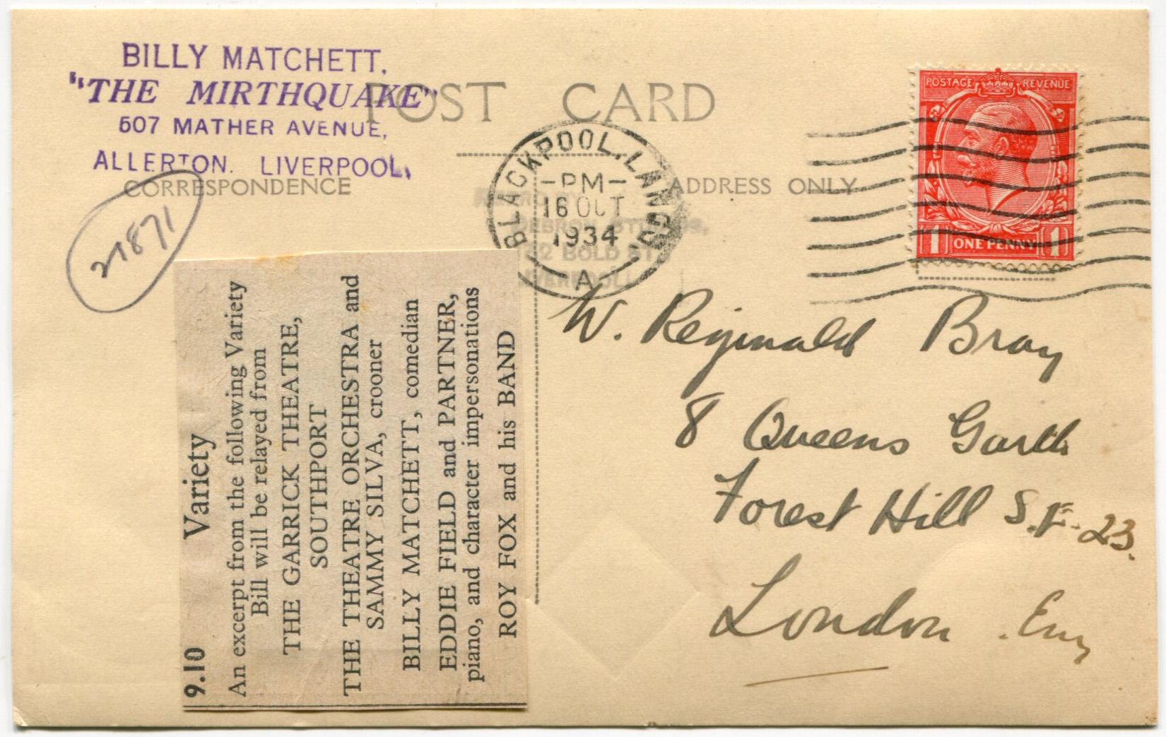 Picture postcard sent to Bray by Billy Matchett on 16th October 1934 in response to Bray's request for his autograph.
