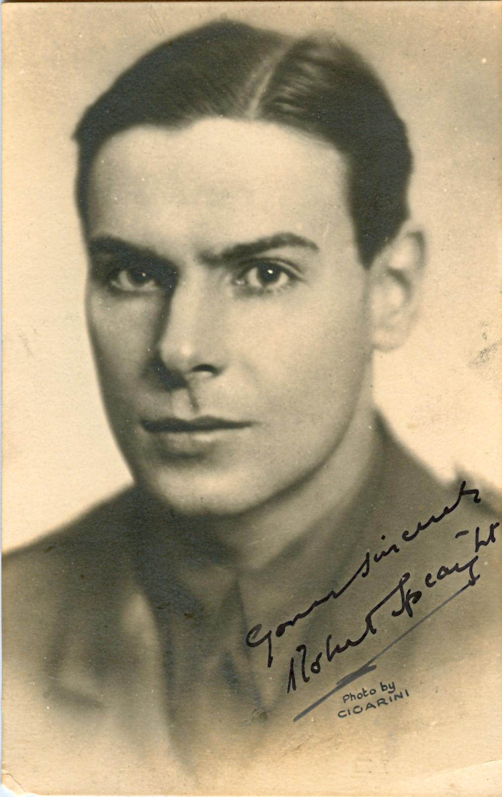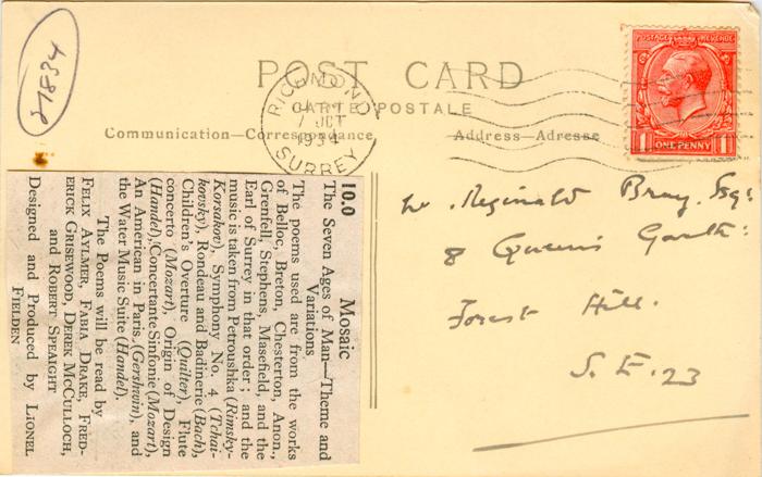 Picture postcard sent to Bray by Robert Speaight on 7th October 1934 in response to Bray's request for his autograph.