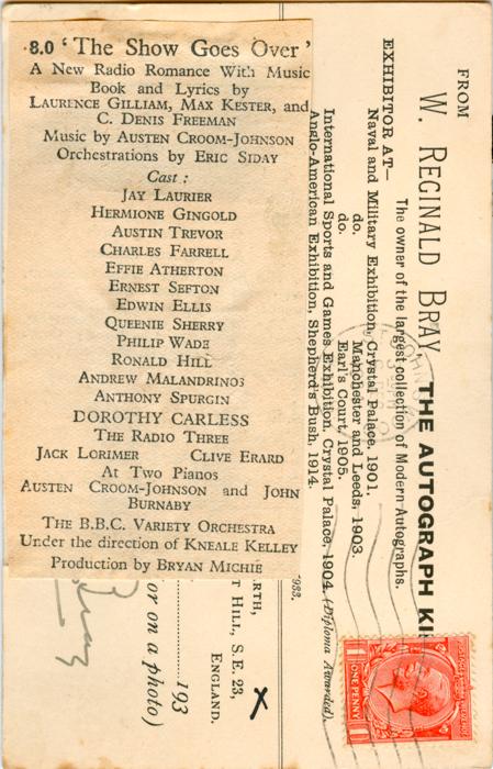 Postcard sent by Bray to Austin Trevor on 27th November 1934 asking for his autograph.