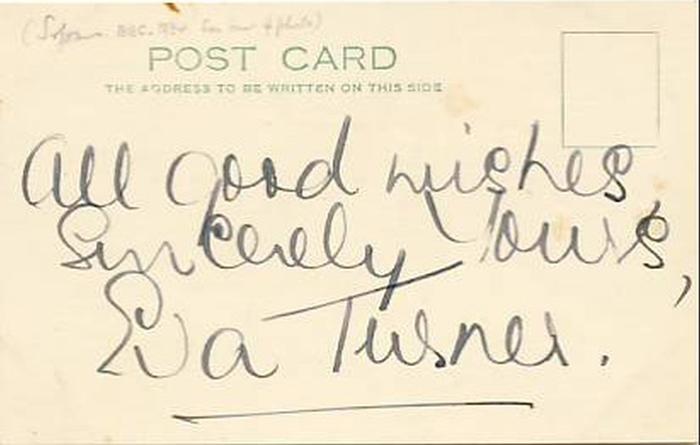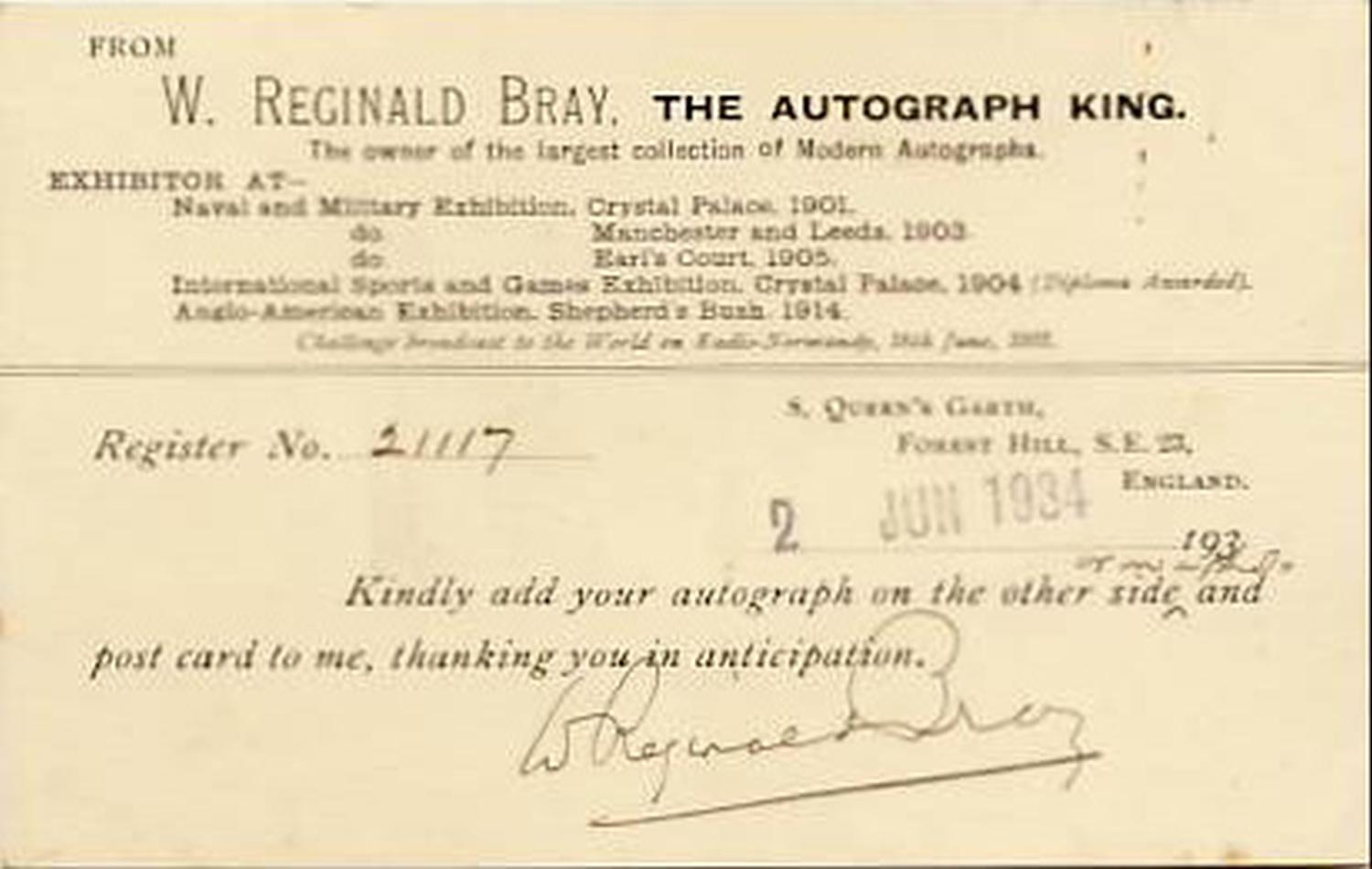 Postcard sent by Bray to Eva Turner on 2nd June 1934 asking for her autograph.