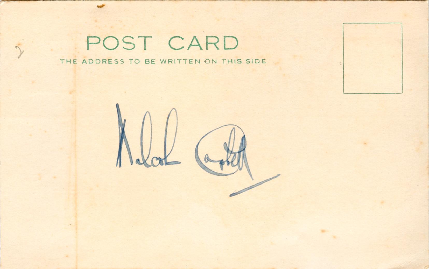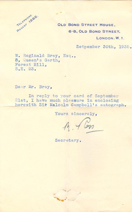 Postcard sent by Bray to Sir Malcom Campbell on 21st September 1935 asking for his autograph.