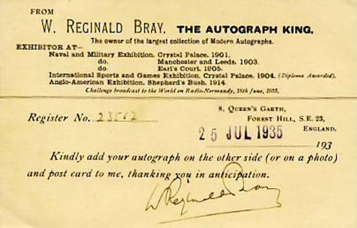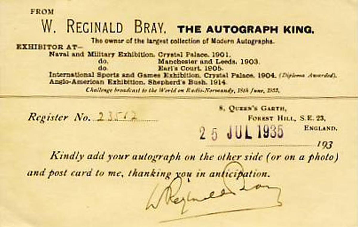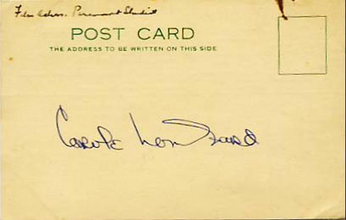 Postcard sent by Bray to Carole Lombard on 25th July 1935 asking for her autograph.