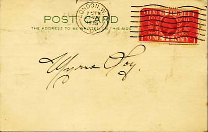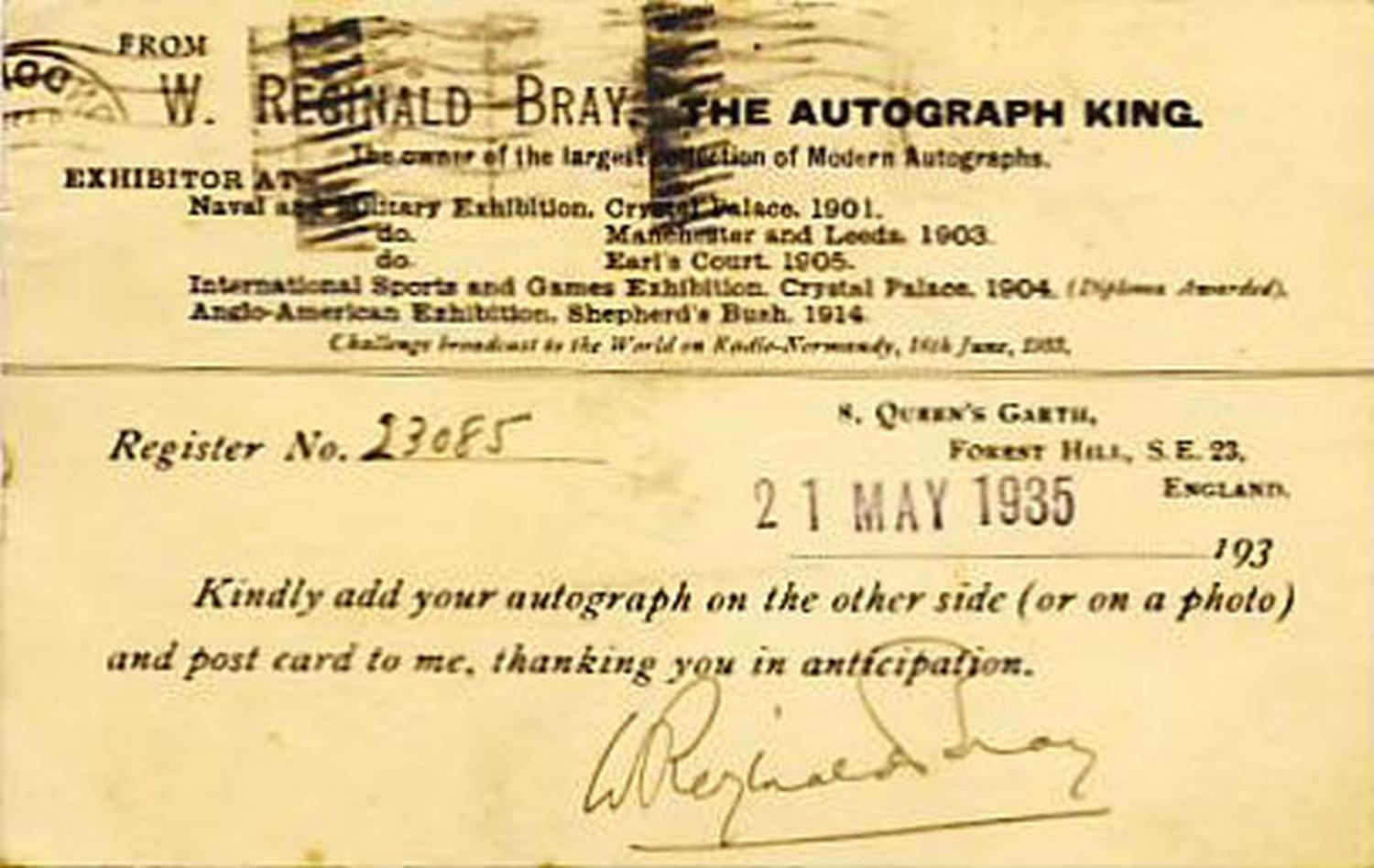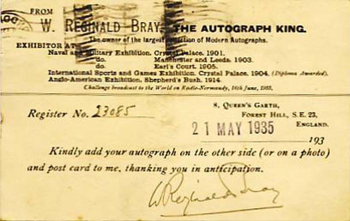 Postcard sent by Bray to Myrna Loy on 21st May 1935 asking for her autograph.