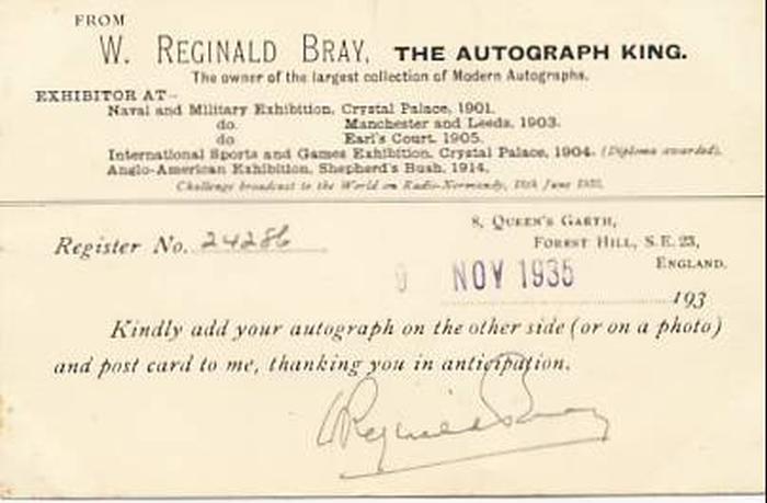 Postcard sent by Bray to Stanford Robinson on 9th November 1935 asking for his autograph.