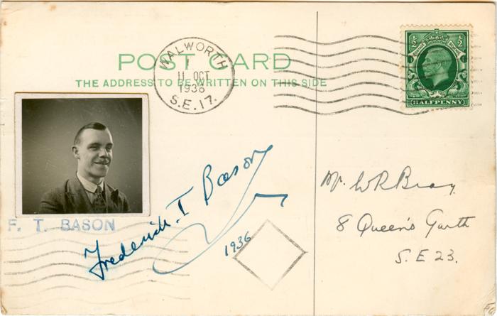 Postcard sent by Bray to Frederick Thomas Bason on 10th October 1936 asking for his autograph.