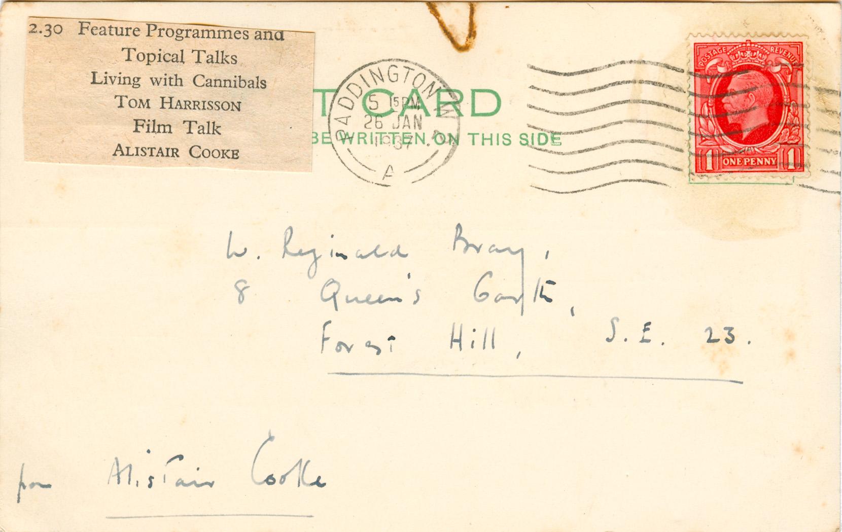 Postcard sent by Bray to Alistair Cooke on 10th October 1936 asking for his autograph.