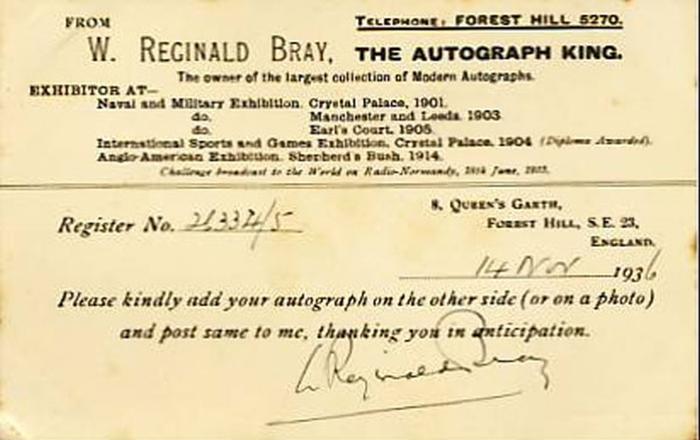 Postcard sent by Bray to Howard Marion-Crawford on 14th November 1936 asking for his autograph.