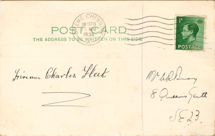 Postcard sent by Bray to Charles Fleet on 19th November 1936 asking for his autograph.
