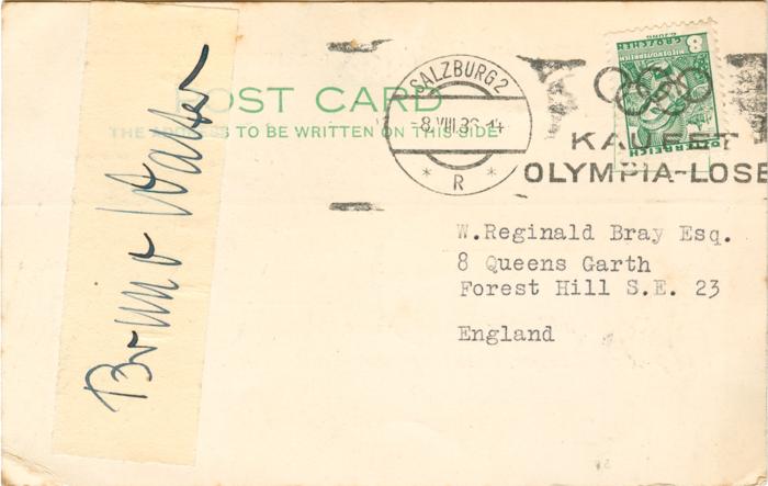 Postcard sent by Bray to Bruno Walter on 18th July 1936 asking for his autograph.