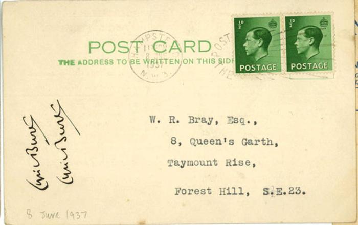 Postcard sent by Bray to Cyril Burt on 5th June 1937 asking for his autograph.