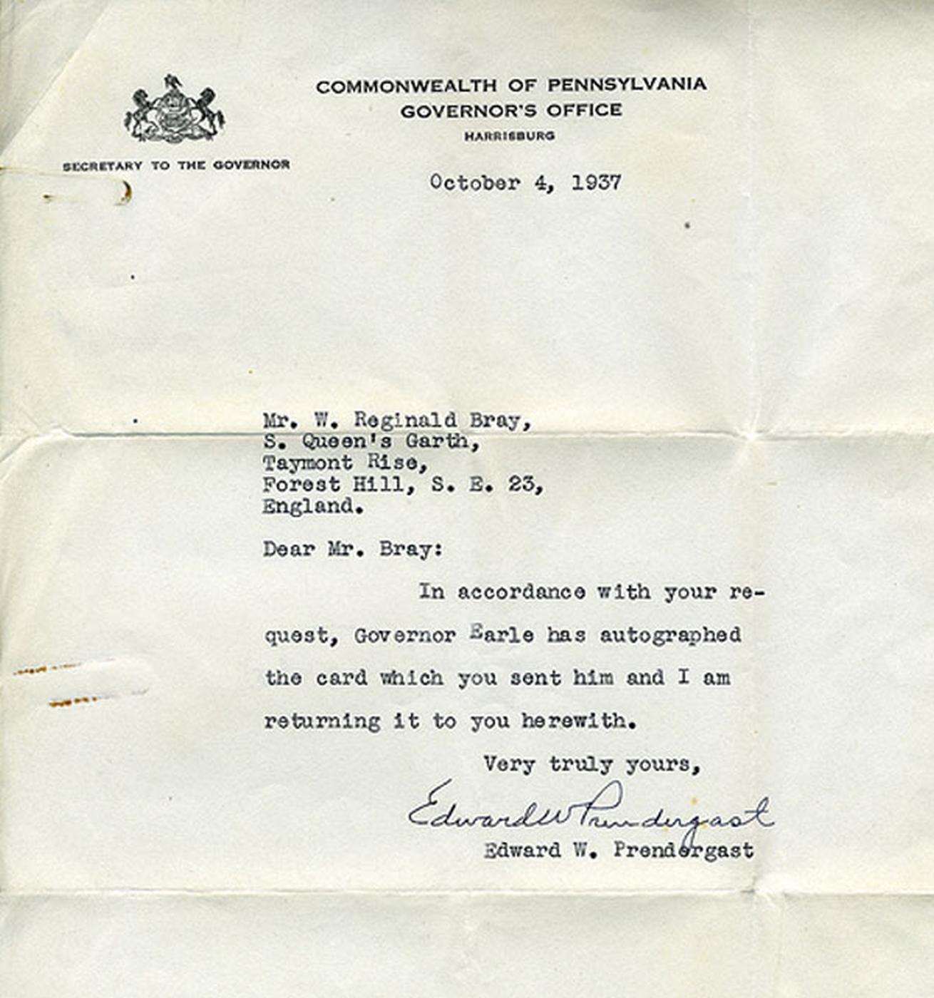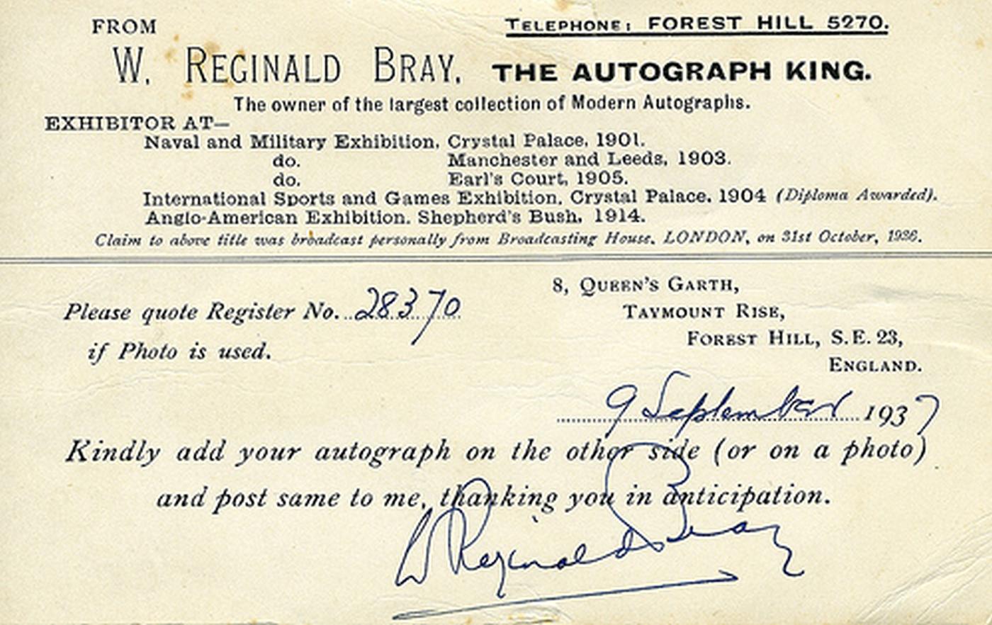 Postcard sent by Bray to George H. Earle on 4th October 1937 asking for his autograph.