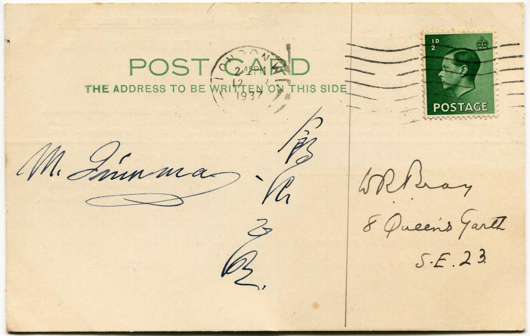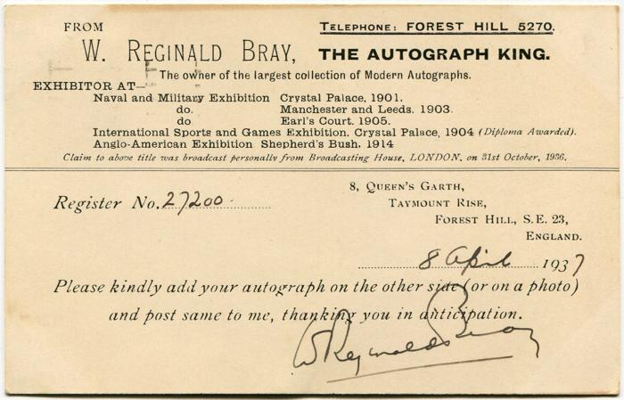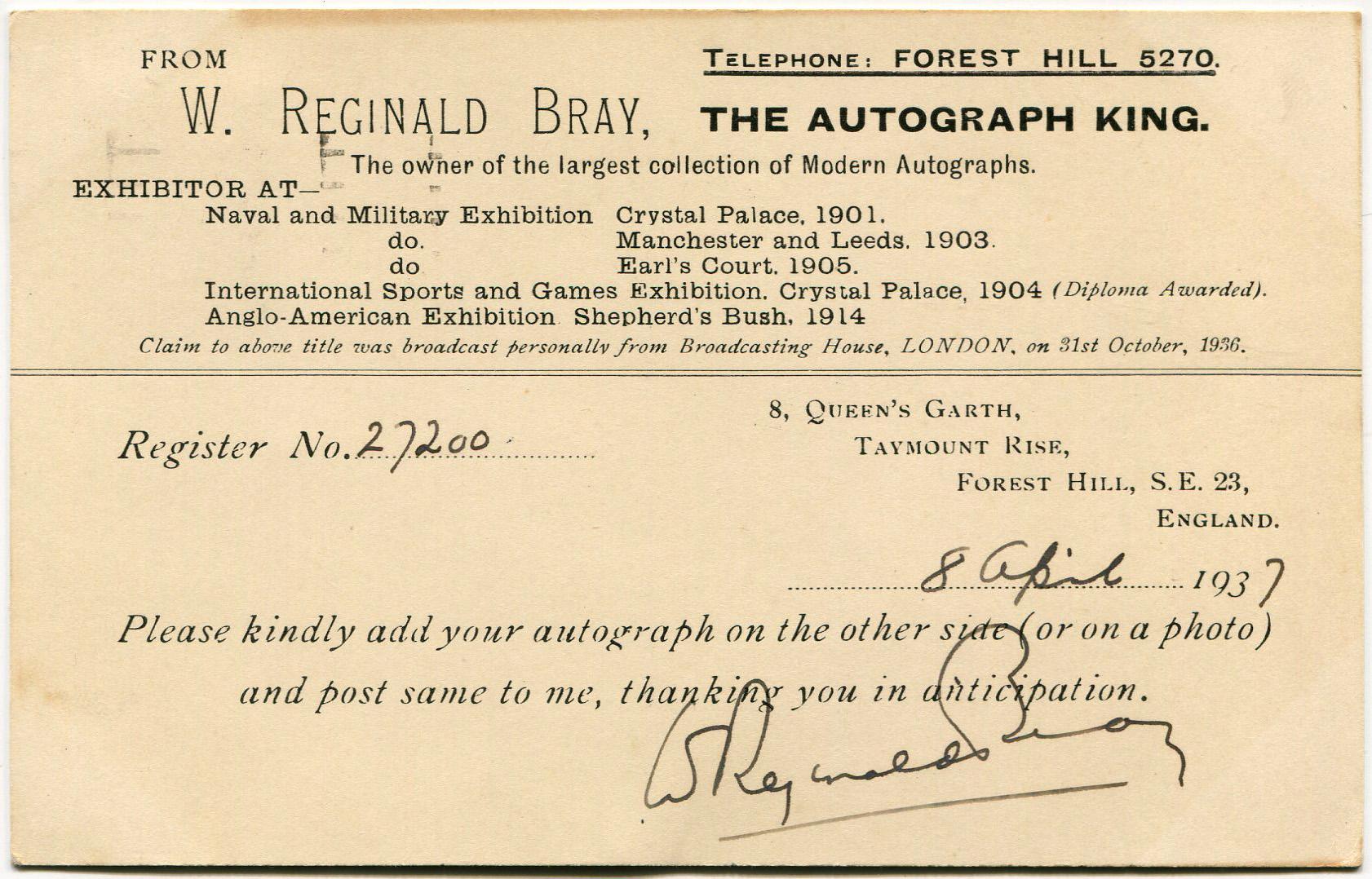 Postcard sent by Bray to Masaaki Linuma on 8th April 1937 asking for his autograph.