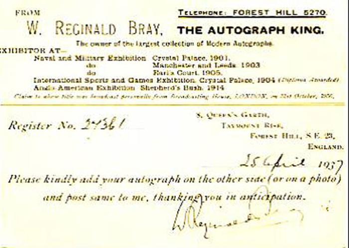 Postcard sent by Bray to Victor Silvester on 25th April 1937 asking for his autograph.