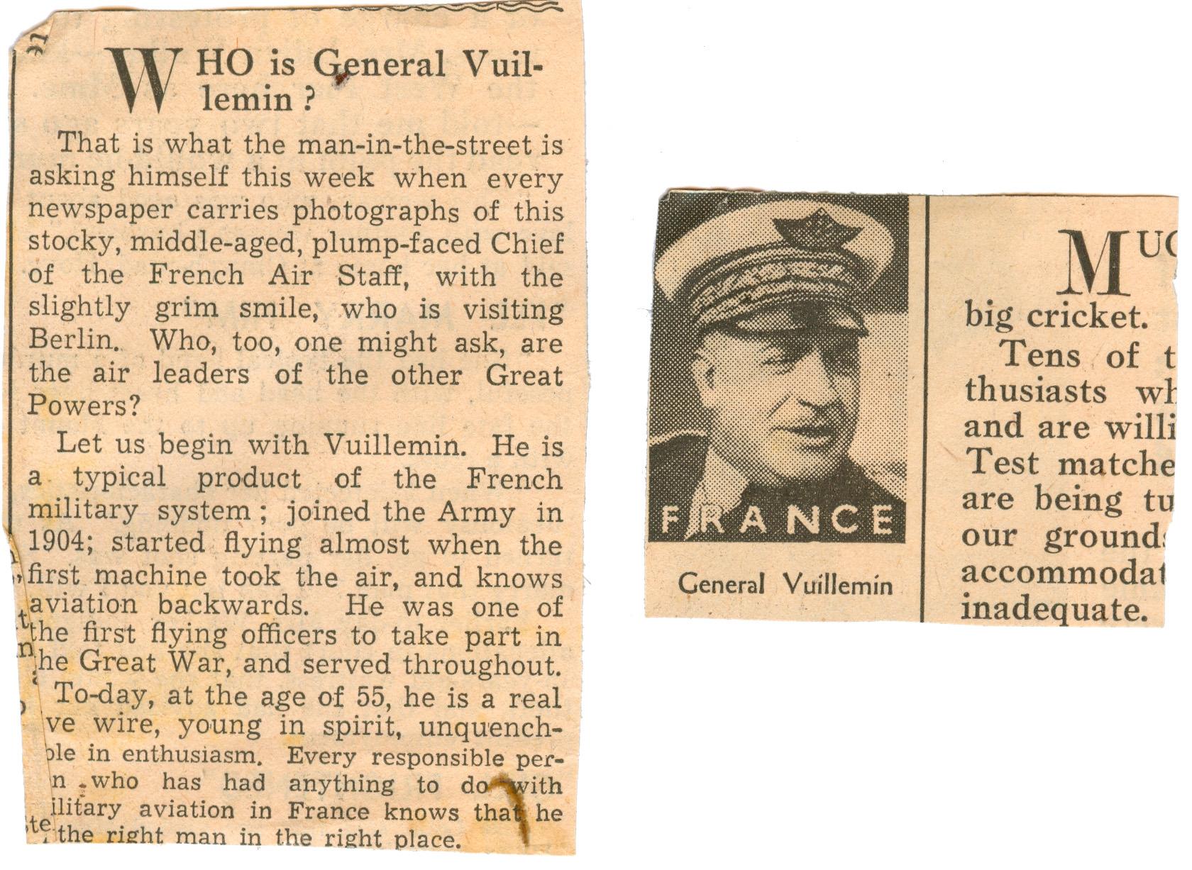 General Joseph Vuillemin (14 March 1883, Bordeaux - 23 July 1963, Lyon) was a French military aviator who took part in both world wars. He was Chief of Staff of the French Air Force during the first year of World War II.